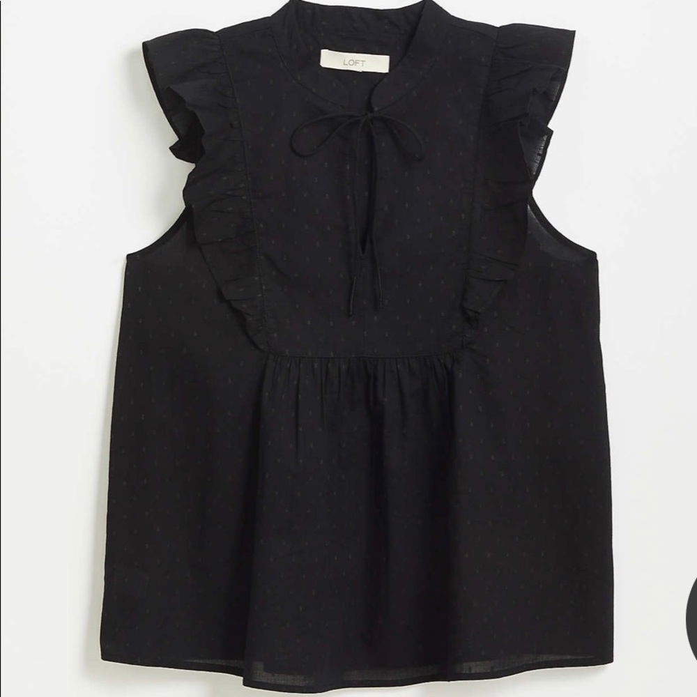 LOFT Clip Dot Ruffle Shell is a super cute, light weight/ linen blouse with a tie collar and cute ruffles. Light dot pattern.