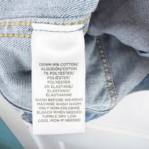 LOFT Ann Taylor Collared Long Sleeve Polka Dot Denim Jacket Stretch Size Large L Preppy. Very good, preowned condition. Front, flap, button pockets. Slit pockets at front. Buttons on cuffs. Buttons on waist for a regular or cinched fit. 91% cotton/7% polyester/2% Elastane. Machine wash. Tumble dry low. Black polka dots on blue denim fabric.