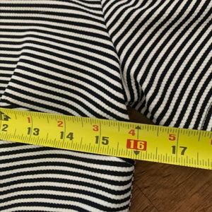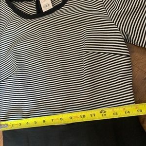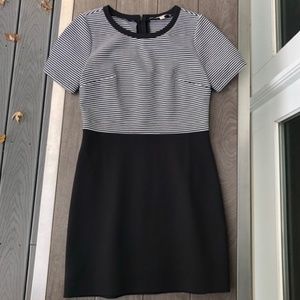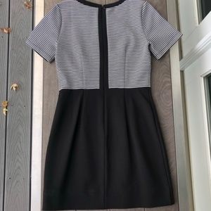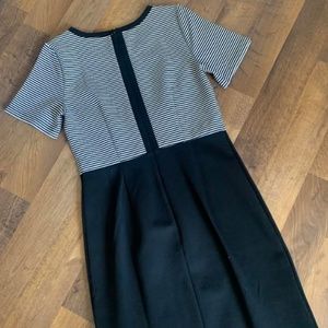 This dress is ready for your board room! Fitted solid black skirt with a striped top. Bust has darts to give you a great shape! The back features a thick stripe down the zipper.