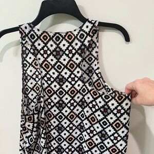 Stylish LOFT top with a bold diamond pattern and racerback cut. Features black, white, and brown colors. Longer style, perfect tucked in to pants for a casual and cool look