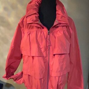 Lightweight coral utility jacket with layered ruffle back. Elastic hem for a relaxed fit. Snap-front closure and long sleeves. Casual style perfect for everyday wear.
