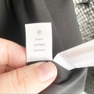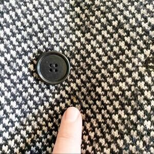 LOFT Cotton Wool Black & White Peacoat Double Breasted Winter Coat Size XS. {Extra Small} V-neckline. Large buttons. Side slit pockets. Stitching is still closed on pockets. Black lining. Back vent detail. Extra button still sewn on tag. Coat has some fuzziness on edges of sleeve openings and bottom hemline. One small yellow-ish mark under bottom buttons. One small pull close to left armpit. See last pictures. Cotton, wool, polyester. Dry clean. Classic style.