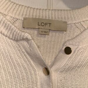 This cream crewneck sweater from LOFT is crafted from a soft knit fabric, offering a lightweight feel perfect for layering. The raglan sleeves add a touch of casual elegance, making it a versatile piece for any wardrobe.