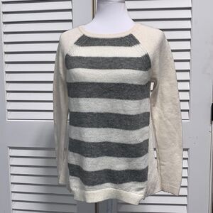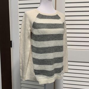 LOFT Womens cream with gray grey stripes front side— crew neck, long sleeve knit sweater — inside care tag was cut out as it was long & bothersome, pic included of fabric content & care for reference, which is blend of acrylic, rayon, mohair & touch of spandex