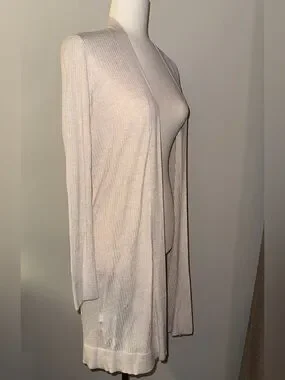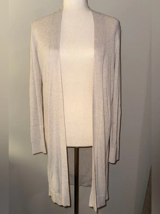Open-front cardigan in soft cream ribbed knit. Lightweight drapey fabric for easy layering. Long sleeves with a relaxed silhouette. Versatile piece for casual or office wear.