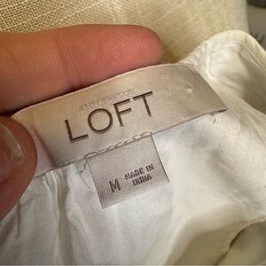 This cream tank top from LOFT features a relaxed fit with pleated details, offering a stylish and comfortable look. The wide, rounded neckline and textured fabric add a touch of elegance, making it perfect for casual outings or relaxed gatherings. Buttons at the back of the neck with a keyhole opening. Features a double layer of fabric.