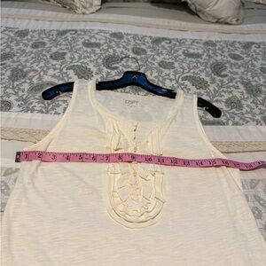 Elegant cream tank with front ruffle detail. Buttons at neck. Scoop neck. Perfect for layering or solo wear. 100% cotton. Size small. Sleeveless. Add sophistication to any outfit. Great for work, date night, or any casual outing.