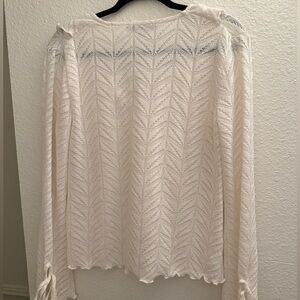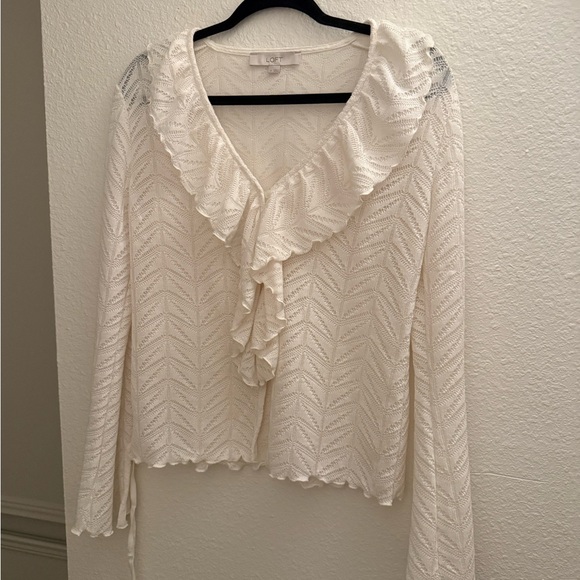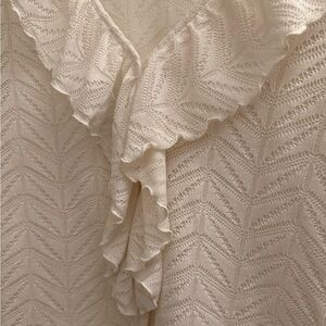 Chic cream blouse with ruffled neckline. Long sleeves and elegant design. Perfect for versatile styling.