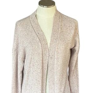 A cream and multi color specs running through yarn cardigan sweater by LOFT featuring an open-front style, longer length with an asymmetrical hemline, and a shawl collar neckline. Color goes with anything!