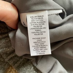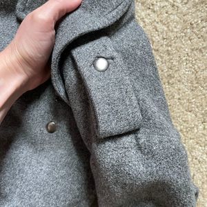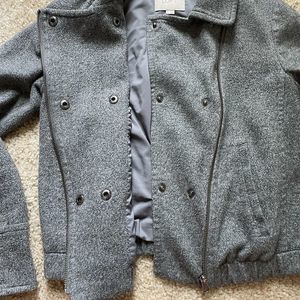 Size XS. Gray with pockets. Has snaps and a zipper. Measures about 20.5” long/cropped length. Lightweight for fall.