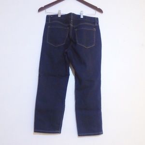 Ann Taylor Loft dark wash. There is a small scuff on the right leg, near the bottom inseam. 85% Cotton, 14% Polyester, 1% Spandex