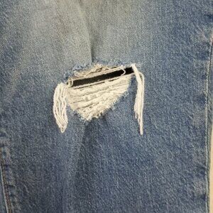 Zip fly with button closure, flat front, five pockets, distressed, frayed hem