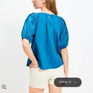 A fuid woven silhouette with flattering raglan puff sleeves, this top pretties up all your tried-and-true looks. Round neck. Short sleeves with elasticized cuffs. Back button keyhole.
