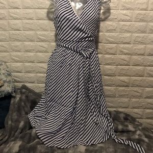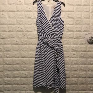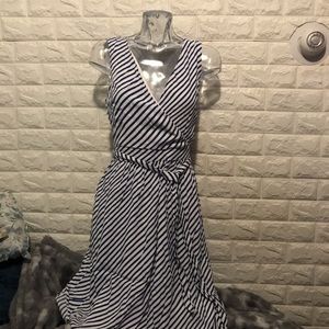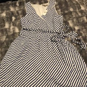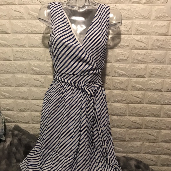Beautiful blue and white striped dress. V neckline and back. Sleeveless. Drawstring waist can be removed if desired.