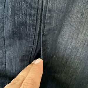 A lightweight alternative to jean shorts, these dark blue chambray shorts will go with everything! Dress them up or go casual - the long length gives them added flexibility! Vertical front welt pockets, still tacked closed. Zipper fly with two outer buttons and one inner button. In excellent used condition