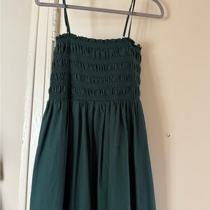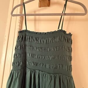 It is dark green and could be midi/maxi dress. Adjustable straps, smocked top, and has pockets.