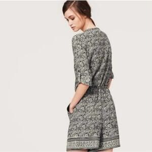 LOFT, size 2, black and white, paisley print, long sleeve romper. Hidden buttons front neckline down to the waist. Sleeves can be rolled up and secured with attached tab and button. Elastic and tie waist. Pockets at either hip. EUC.