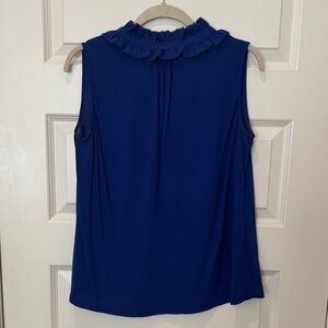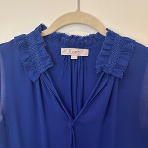 Chic mixed media deep blue blouse with ruffle neck. Ideal for versatile styling.