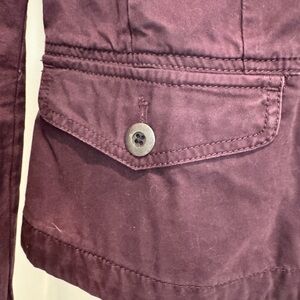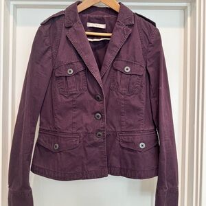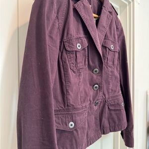 Chic deep purple blazer with button details. Features front pockets and a tailored fit. Ideal for professional or casual wear.