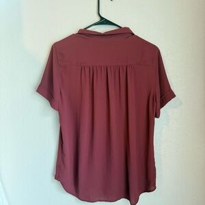 Stylish burgundy button-up blouse with short sleeves. Features two front pockets and a classic collar.