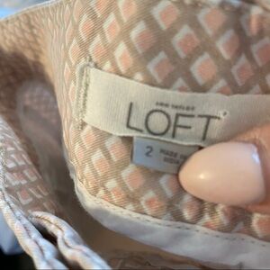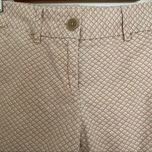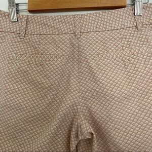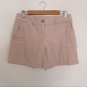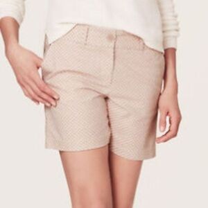 Loft Riviera diamond printed shorts. Front slash pockets& coin pocket. back welt pockets. Zip fly with button cosure. Tan/beige, pink & white diamond design. Fun, neutral print for summer in the perfect length shorts!