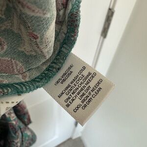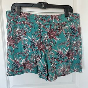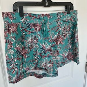 LOFT drawstring shorts in teal and burgundy print. Approx 3” inseam.
