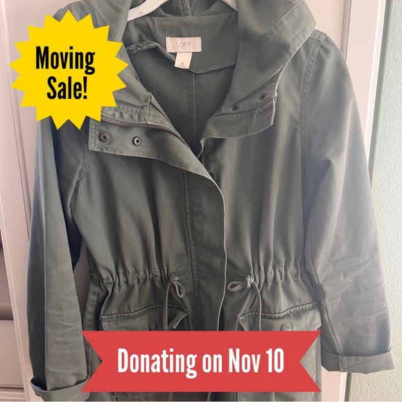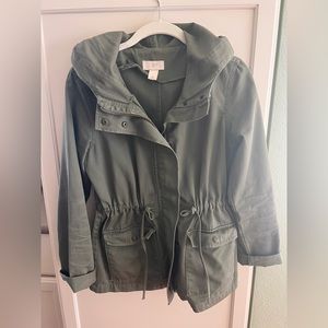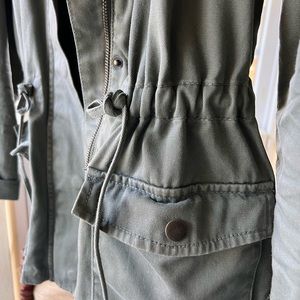 Utility Jacket with Drawstring Waist. Has deep pockets with button closure and zipper covering. Beautiful light green sage color.