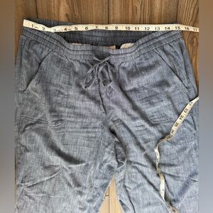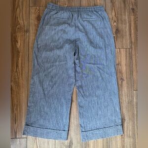 Relaxed wide-leg pants with a drawstring waist. Soft textured fabric and stitched detailing. Comfortable casual silhouette for everyday wear.