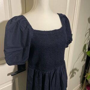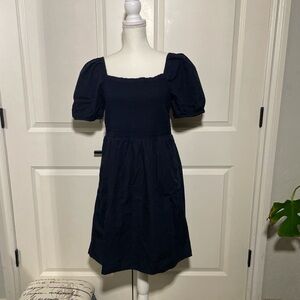 Chic black dress with smocked bodice. Features square neckline and puff sleeves. Ideal for versatile styling.