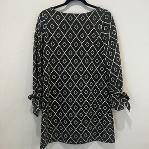 LOFT Dress Womens Size S Gray White Diamond Tie Cuff Sleeve Shift Mini Office
