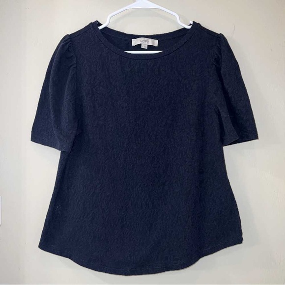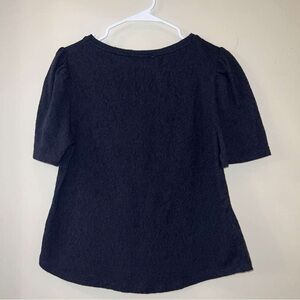 Stylish black blouse with puff sleeves. Textured fabric adds sophistication. Perfect for any occasion.