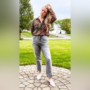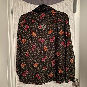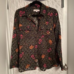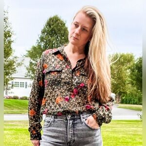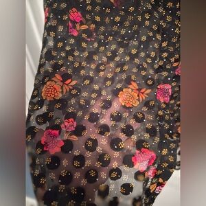 Forest green with deep pink and orange flowers. Velvet feel darker green polka dots add fun texture. Fully functional button down. Excellent condition. 100% polyester. (BIN6)