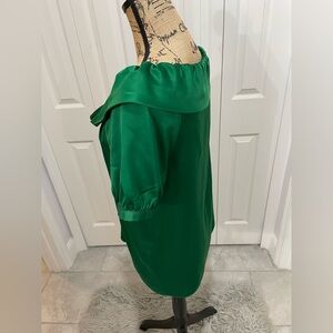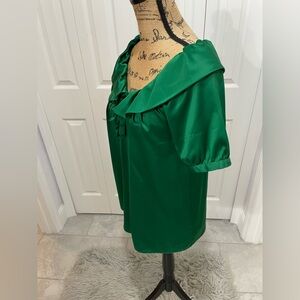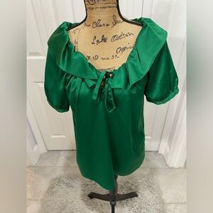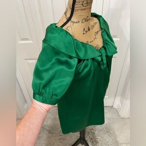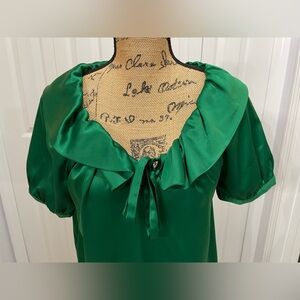 Beautiful emerald blouse with ruffled neckline. Short sleeves and tie detail add elegance.