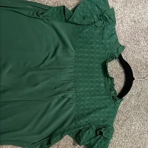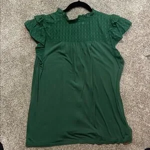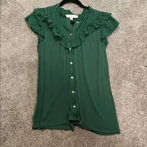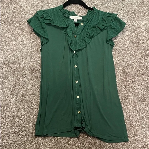 Elegant blouse with ruffled neckline. Button-up front. Perfect for any occasion.