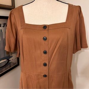This chic brown sheath dress from LOFT features a flattering square neckline and flutter short sleeves, making it ideal for both casual and work settings. Its mini length and tailored fit offer a stylish and comfortable look for any day.