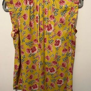 Ruffles frame this flowy, flattering button-neck top in yellow and pink