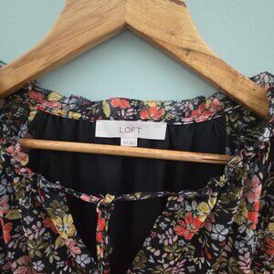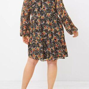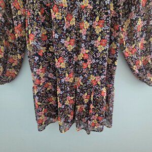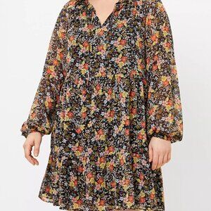 LOFT FLORAL BABYDOLL DRESS WITH LONG SLEEVES, BLACK/MULTI-COLORED FLOWERS Medium