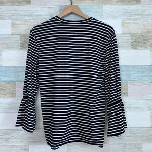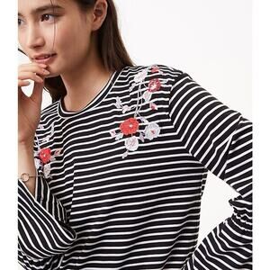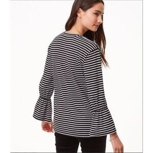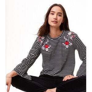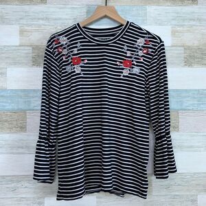 LOFT Floral Embroidered Striped Top Black White Bell Sleeve Womens Medium