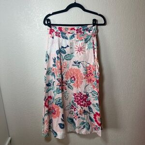 Fresh, feminine, and flowy—this LOFT floral midi skirt is a must-have for spring and summer wardrobes. Featuring a beautiful multicolor floral print on a soft pink background, this skirt is perfect for both casual days and dressed-up occasions.