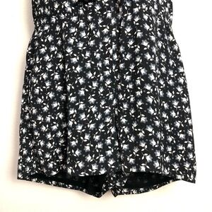LOFT floral print halter romper in excellent gently used condition. Black, white and grey floral print, halter straps with flounce trim and front bow, hidden rear zipper, elastic waist, diagonal pockets, fully lined.