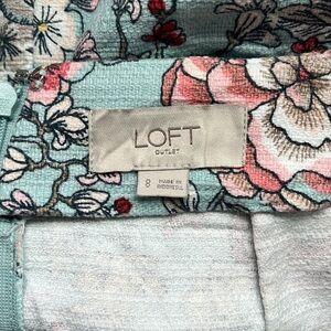 This is a LOFT women's skirt in size 8, featuring a floral print in light blue and pink. The skirt has a zipper closure and is made of a cotton blend material. It is knee-length and has a straight & pencil style, perfect for various occasions like travel, parties, casual wear, and work/business settings. The skirt is lined and suitable for all seasons, with a bohemian and preppy theme.
