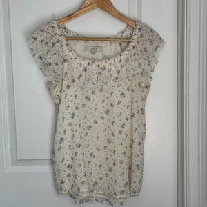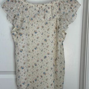 -A ruffled neck and flutter sleeves top this smooth and fluid top with romance.