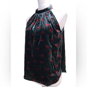 LOFT Green Crushed Velvet Halter with Red Floral Pattern Size XS
