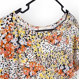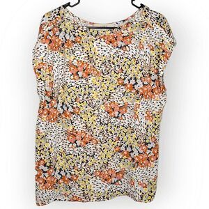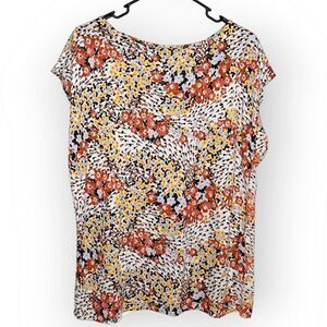 White background with navy, yellow, salmon, light blue, and light olive feminine floral designs throughout