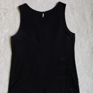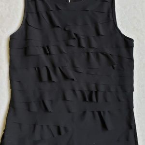 Black layered ruffle shell tank from LOFT. Mixed media. Back is soft, front is slinky and flowy. Very forgiving. Fits sizes small and medium, as it is stretchy. Smoke free and immaculate home. Bundle to save. Don't hesitate to reach out if you have questions!