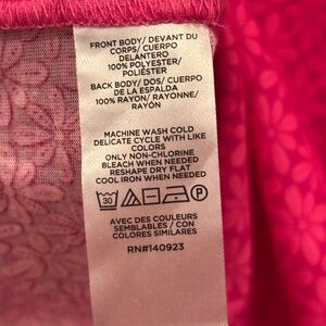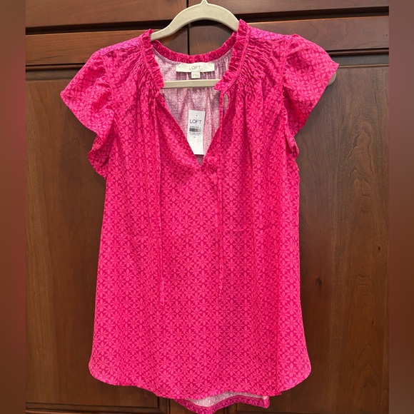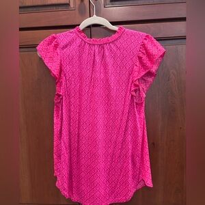 Chic fuchsia blouse with geometric design. Ruffle cap sleeves and gathered neckline. Ideal for casual or work settings. Vneck with strings. NWT.