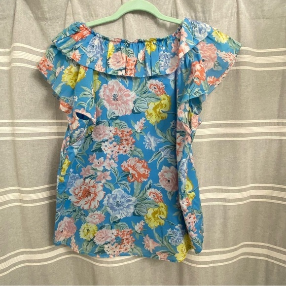 LOFT / Garden Ruffle Blue Floral Print Flutter Sleeve Blouse Size M