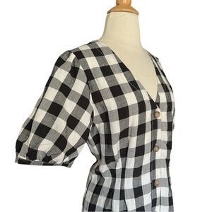 Elevated classic black and white gingham check dress that’s perfect for the warm weather months. It’s constructed in 55% linen 45% rayon and lined in cotton. It features a button up front, v-neckline, and short puff sleeves.