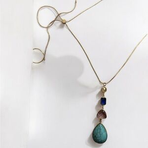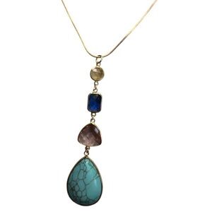 This exquisite LOFT necklace showcases a delicate gold chain adorned with a striking pendant featuring a series of vibrant gemstones. The centerpiece is a deep blue stone, complemented by a turquoise teardrop at the base, creating a captivating contrast. Its elegant design makes it a perfect accessory for any occasion.