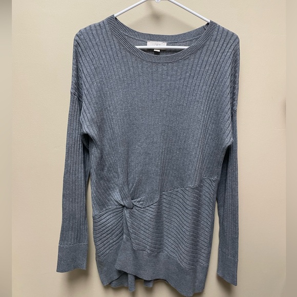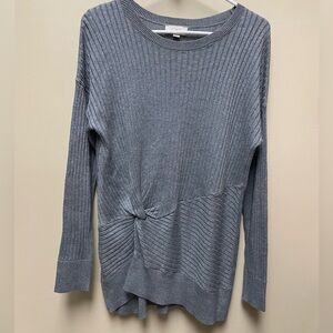 Stylish ribbed knit top. Features a unique twist detail. Long sleeves and round neckline.